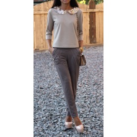 Удобные трикотажные брюки с хорошей посадкой на бедрах. Спереди карманы и складки. Сзади резинка на поясе и рельефы-швы.